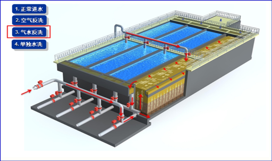 2.2 專有的氣水聯(lián)合反沖冼裝置、布氣裝置、操作工藝等系統(tǒng)集成技術(shù)有效解決直接過濾、生物濾池生物膜脫落堵塞濾池的問題;