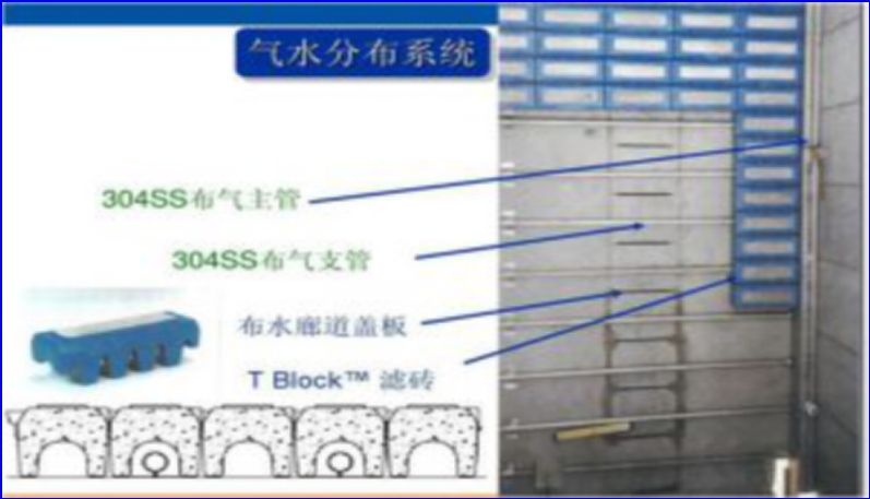 ◇ 氣水分布系統(tǒng):采用“T”型氣水分布塊濾磚技術(shù),反沖洗不銹鋼主、支氣 管;淘汰了長柄濾頭和濾板。無易損易耗件;