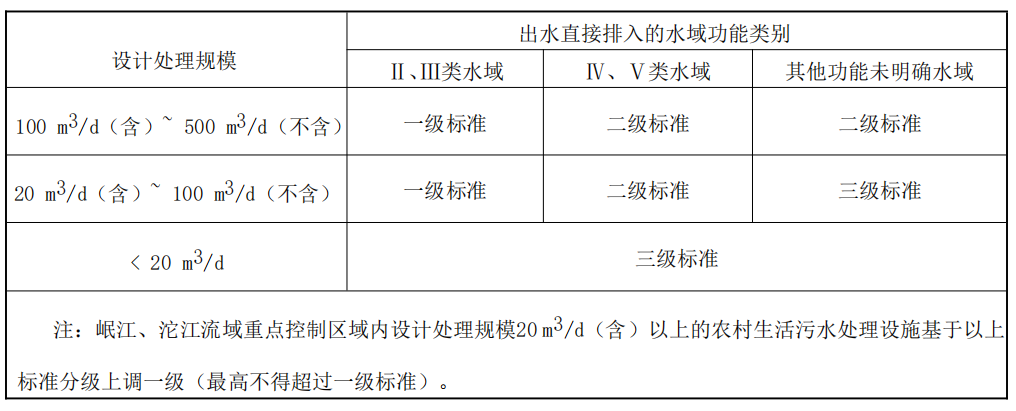 b) 根據(jù)污水處理設(shè)施出水直接排入的水域功能類別和設(shè)計(jì)處理規(guī)模,將農(nóng)村生活污水處理設(shè)施水污染物排放標(biāo)準(zhǔn)劃分為一級(jí)標(biāo)準(zhǔn)、二級(jí)標(biāo)準(zhǔn)和三級(jí)標(biāo)準(zhǔn),各級(jí)標(biāo)準(zhǔn)的適用情況見(jiàn)表 1。其中, 岷江、沱江流域重點(diǎn)控制區(qū)域內(nèi)(參見(jiàn)附錄A),設(shè)計(jì)處理規(guī)模 20 m3/d(含)以上的農(nóng)村生活污水處理設(shè)施對(duì)應(yīng)表 1 所列標(biāo)準(zhǔn)上調(diào)一級(jí)(最高不得超過(guò)一級(jí)標(biāo)準(zhǔn));