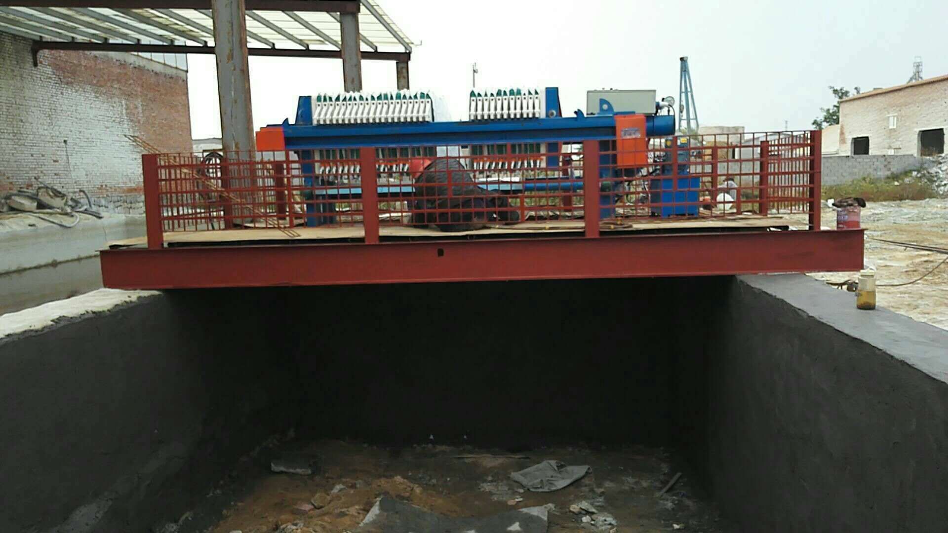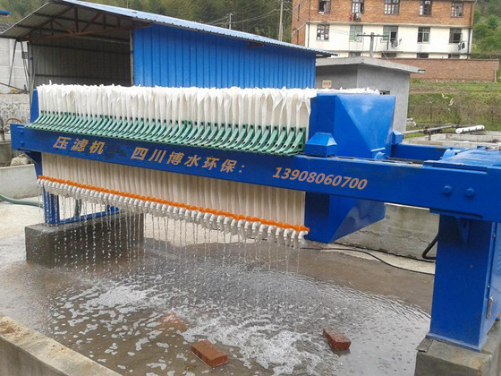 濾布裝在濾板的兩側(cè),在壓緊裝置的作用下,濾板被壓緊在壓緊板和止推板之間,每兩塊兒濾板之間形成了一個(gè)封閉的過濾空間,